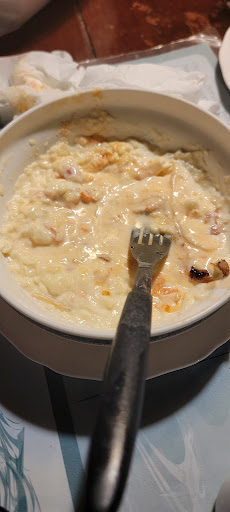 Read moreI don't know how long this place has been here but it needs a good cleaning and update. Waiter couldn't repeat my order immediately after I gave it. We were 6 people and orders came out 2 at a time. So first 2 people were done eating when last 2 orders arrived. If you're going to eat anything at all I would chose the pork rib.. I had the Kansas city style. It was nice and hot but the mashed potatoes were terrible, pasty and tasteless. Mildly warm. Baked beans were cold. Some people like them that way but not for dinner. Everyone at the table had the ribs but 1 had the smoked salmon spaghetti. They most disgusting thing I ever tasted. I don't think anyone tastes the food that they serve. I attach a picture of the spaghetti. Does it even look like spaghetti? Horrible. How can you serve this to somebody. Table setting was good with cloth napkins and silverware after I reminded the waiter that we had nothing...