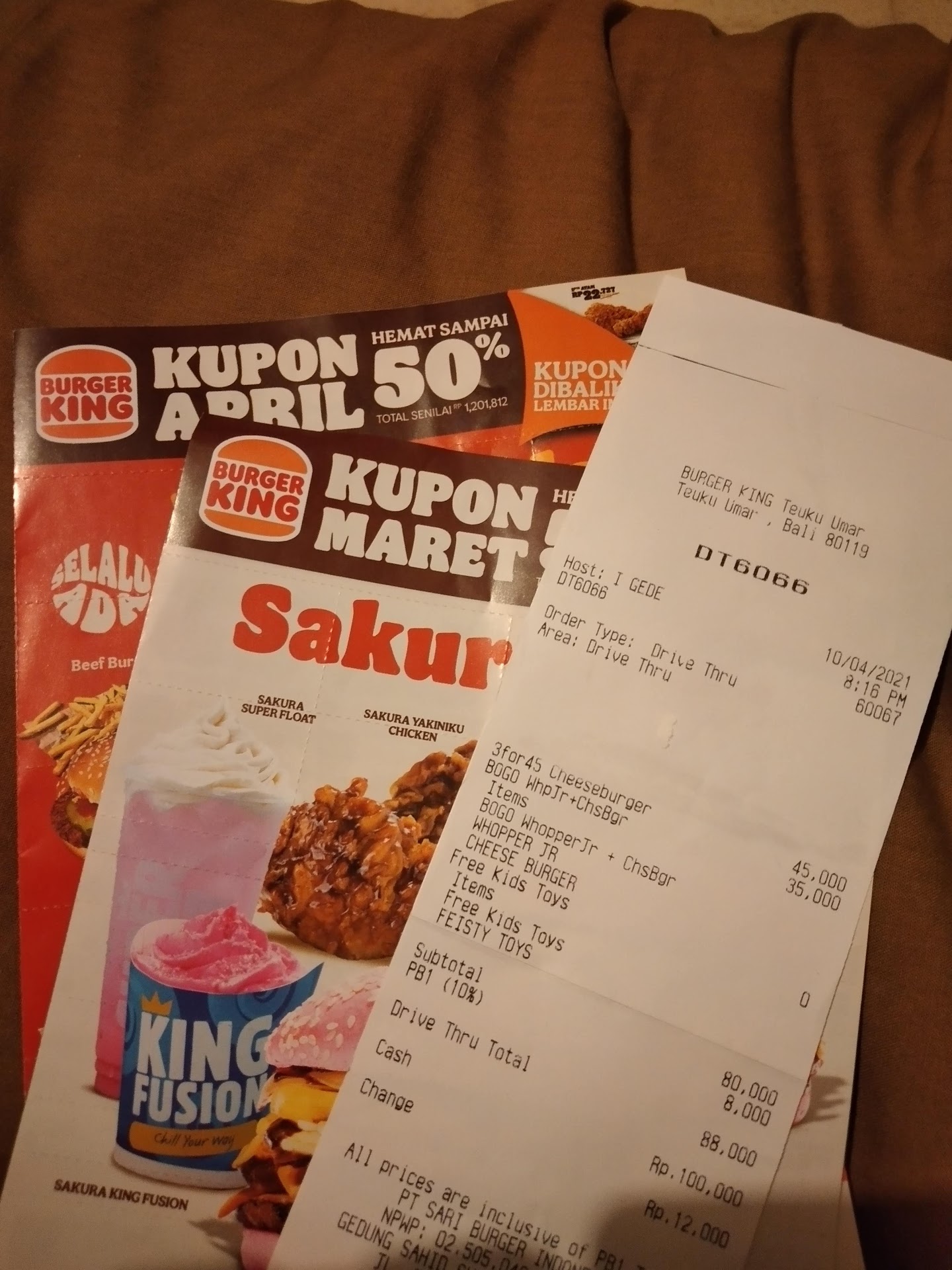 Dine in: Nice place for a fast food restaurant. Always clean. They provide mushola or prayer room for Muslims. Have nice balcony area and more seating area. Parking is pretty wide. But as all Burger Kings chained restaurant, don’t expect more personal services from staffs like KFC or McDonalds.