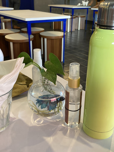 The place is large and spread out, well air conditioned. But as soon as I sat down I noticed this poor little fish a jar no bigger than my fist. I noticed other reviews that mention the same cruelty from as long as 10 months ago, the owners claiming to take action but until now it's clear they didn't follow through. I hope my review emphasizes this problem and what a bad example it sets. It made me sad to sit there and see this poor little fish stuck in murky water in this tiny jar so I moved it to another table.