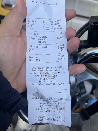 Siang tadi saya mampir ke burger bangor yang deket tempat kerja niatnya beli burger. Ternyata sepi, saya yg pertama pesen disaana. Setelah menunggu 10 menitan mulai ada cust dan ojol yg datang. Lama banget saya tunggu, eh akhirnya customer yg datang setelah saya dapat duluan makanannya, sedangkan saya belakangan dapatnya. Padahal rame banget staffnya dibelakang 😭😭Dan saya pesen super deal yang isi juragan chesse burger. Tapi burgernya ukurannya lebih kecil ya sekarang? Dan bentukannya malah kayak jelata chesse. Biasanya dikasi slice keju tapi ini malah ga dikasi, sayurnya biasanya lengkap diisi dan banyak kalau dioutlet lain (yg deket rumah saya), disini cuman isi selada aja. Pattynya mirip jelata burger. Jadi nyesel beli disini padahal aku udah langganan banget sama burger bangor...
