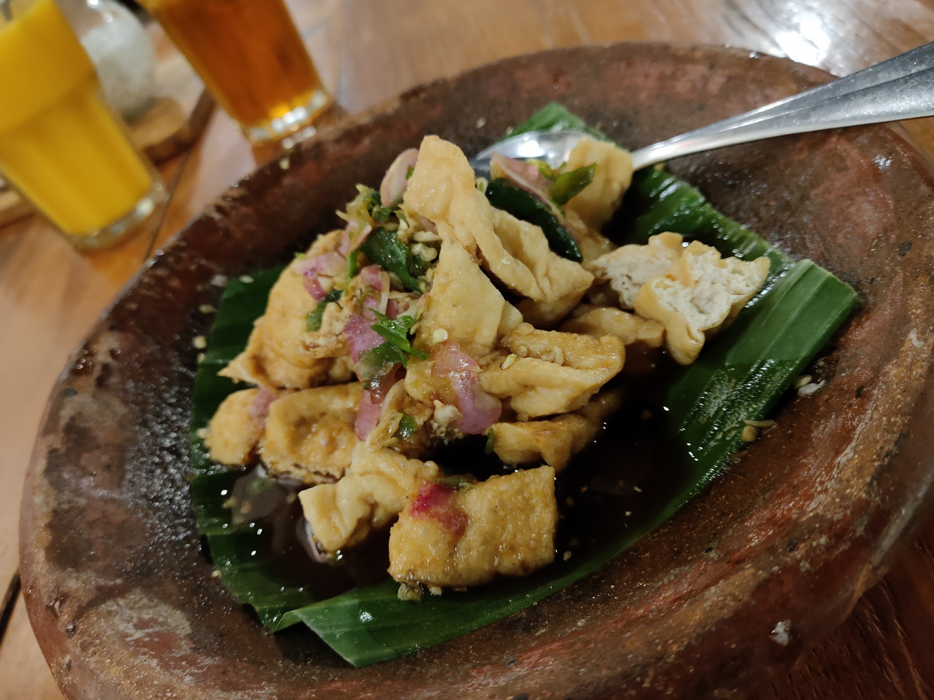 Food: Most dishes in their menu are Indonesian Food. We ordered 4 dishes such as Tahu Gejrot, Nasi Goreng Suna Cekuh Cumi, Vegetarian Lumpia, and Chicken Steak with Mashed Potato. If you're craving for salad, hamburger or Sandwich, they don't have any of it. They only serve salad with mayonnaise dressing. However, they do have several selection of international-inspired cuisine like Beef or Chicken Steak, Spaghetti, I think one Tom Yum dish, and Fish and Chips.