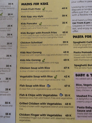 The food is great and a mixture of Indonesian and western dishes like Burger and Pizza. They have a large kids menu and also very good coffee from an Italian coffee machine.