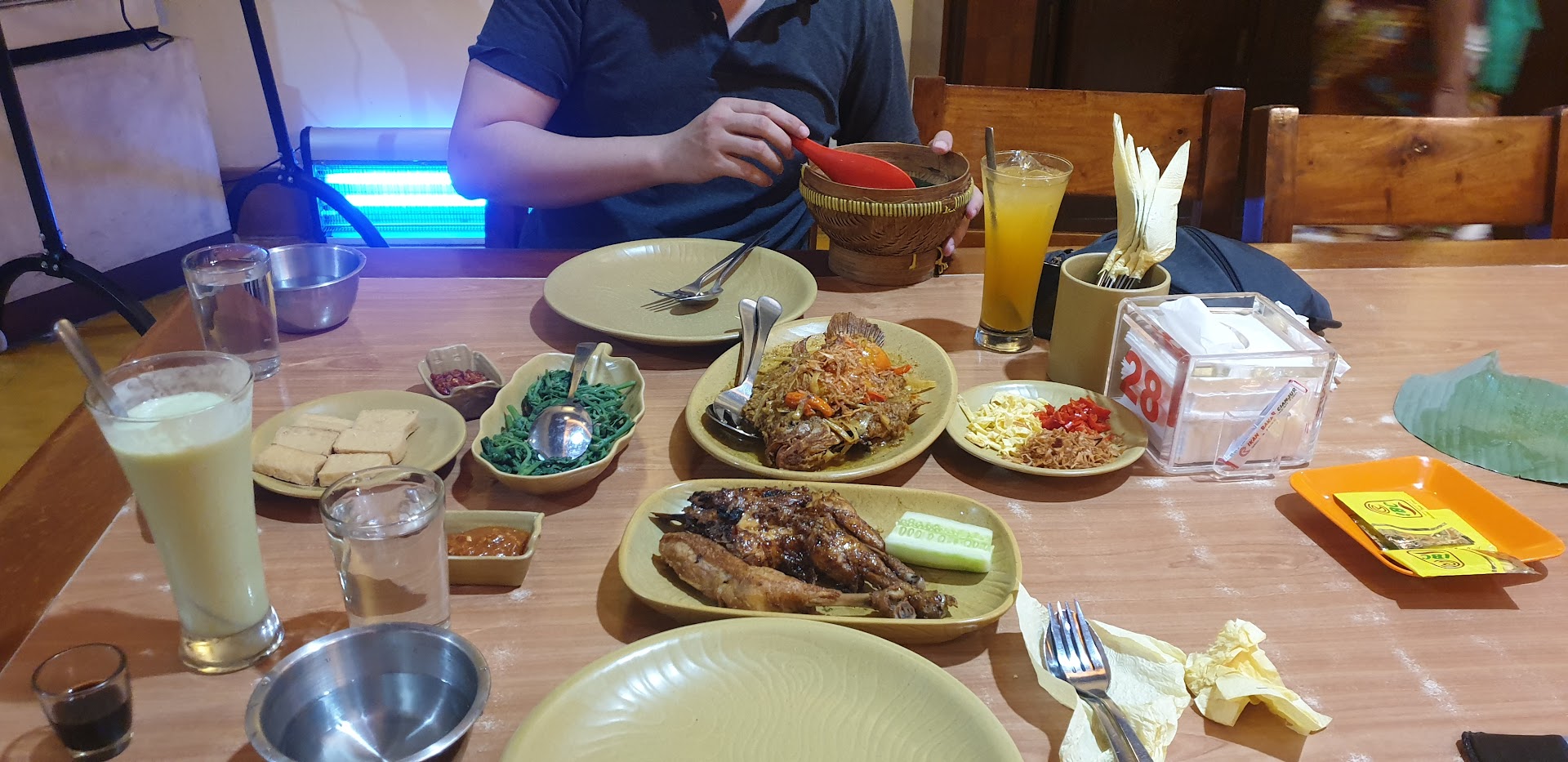 Such a classic, elegant and beautiful traditional Indonesian setting with delicious menus. We went here before traveling back to Jakarta as the restaurant is not so far from the international airport. We ordered grilled Gurame or carp fish, fried rice, grilled chicken, steamed rice and karedok, or the Indonesian fresh veggies, salad with peanut sauce. We also enjoyed fried tempe and fried tofu. All of them are yummy! It came with sambals or chili and the pickles as well.