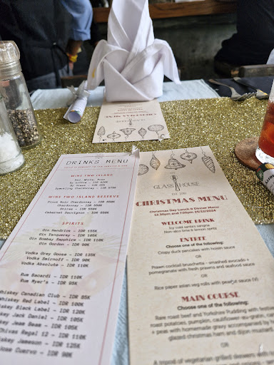 The Glasshouse Sanur Christmas lunch at The Glasshouse on Sanur was absolutely perfect! On arrival, we were shown to our table straight away and offered the choice of a Sangria, or Mocktail and when settled, we were personally greeted by the owner, an Australian! Entree was a choice of duck spring rolls and hoisin sauce, or prawn bruschetta with avocado and pomegranate, or Asian vegetarian rice paper rolls with satay sauce. As there were 3 of us we chose one of each. Our choice was definitely the duck rice paper rolls and prawn bruschetta, but the rice paper rolls were still good. Mains were traditional roast beef, roast pumpkin and potato, cauliflower cheese, peas and dumplings with gravy plus a few thick slices of hot ham. Absolutely delicious and the beef was cooked to perfection! As none of us ordered the other choice, I'm sorry I can't comment. Desert was a choice of Christmas pudding and custard, or individual pavlova with mango and passionfruit and a Berry drizzle. We all chose the pavlova and it was a very generous serve, and delicious. All throughout our time there, Benny sang and played his guitar. Christmas sing-a-long first, and afterwards his own repertoire, but also requests from guests. It was so lovely to have music, but live music was the best, along with the interaction of the guests, we all enjoyed it immensely, and so did the staff as they sang along too. It was our first time at The Glasshouse, and even though it was Christmas, we'd definitely go there...