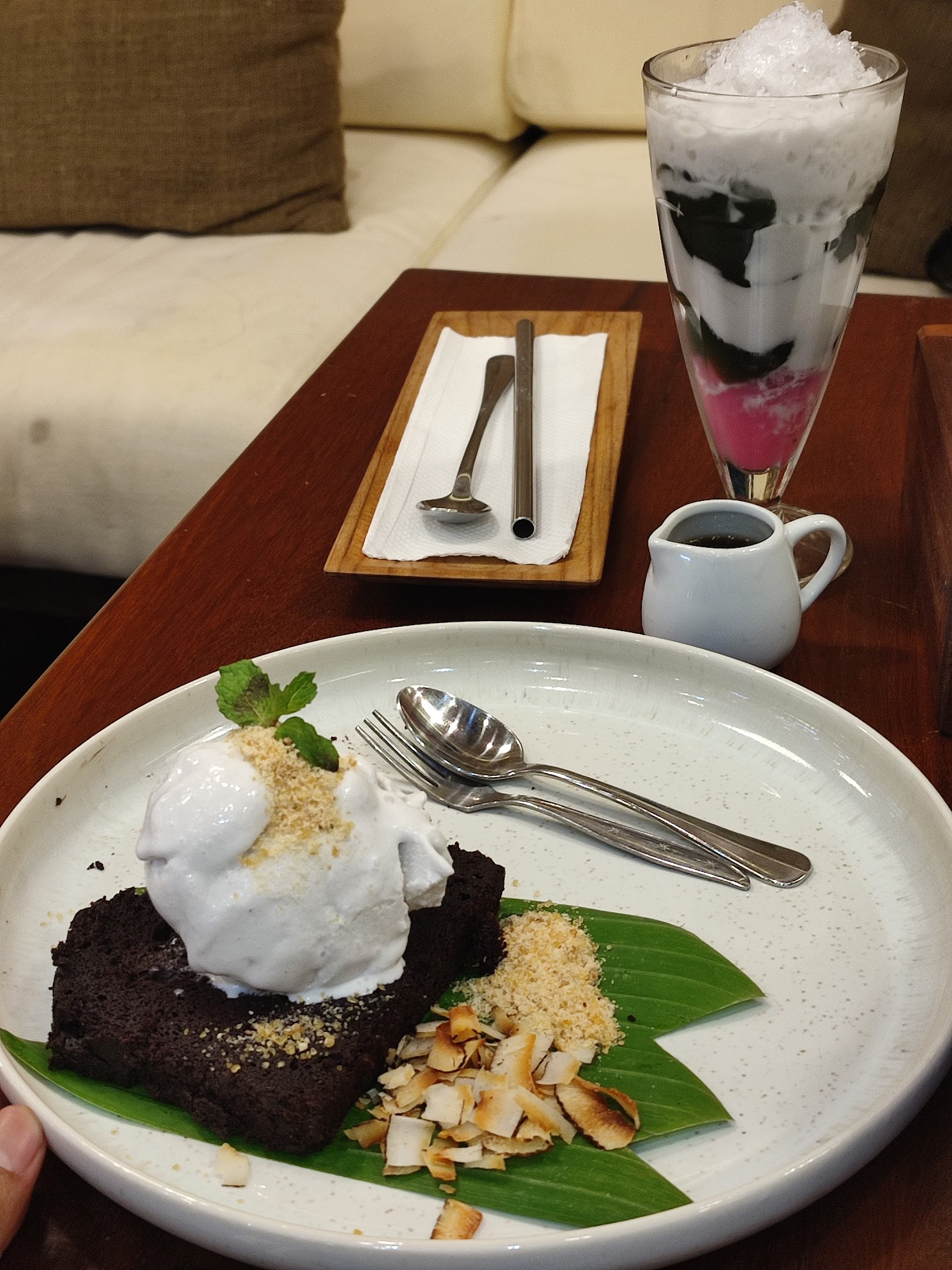 I tried their coconut ice cream served on top of brownies, and it was divine. However, the brownies with ice cream are quite sweet, making them perfect for anyone with a sweet tooth—you’ll absolutely love this indulgent treat! I also ordered a traditional drink called daluman, which features coconut milk, jelly bits, and palm sugar. It was refreshing and flavorful, and for those who prefer less sweetness, the staff can separate the palm sugar syrup so you can adjust it to your liking. It’s a thoughtful touch that makes the experience even better.