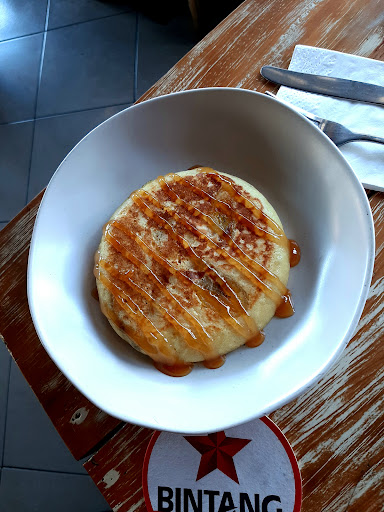 Read moreThe Pengkola, in a beautiful old renovated Balinese property has kept much of its legacy architecture intact. The conical, high ceiling still has cane mats and wooden rafters. The old brick pillars and walls have been deliberately kept paint-free to gel with its old structure. The distressed chairs and tables further lend authenticity to its old-world charm. Its open sides with cane Venetian blinds, make it incredibly air and comfortable, and give clear view of the streets. It's great for people-watching and a 4 pints of Bintang for IDR 400K makes it a compelling restaurant to imbibe and while the time away. Popular Western pop music plays throughout the day on a superb sound system and there's live music every Saturday. It was breakfast time, so I ordered a fruit salad, a banana honey pancake and an iced americano. It's the best pancake I've had in Indonesia so far. It was sizeable, soft and the banana stuffing was just right. The fruit salad was a total surprise. Substantial and with fresh, crunchy mangoes, pineapple, purple dragonfruit and mangoes! Loved my time here. They've free wifi, so it was an excuse to linger after breakfast and just enjoy the ambience...