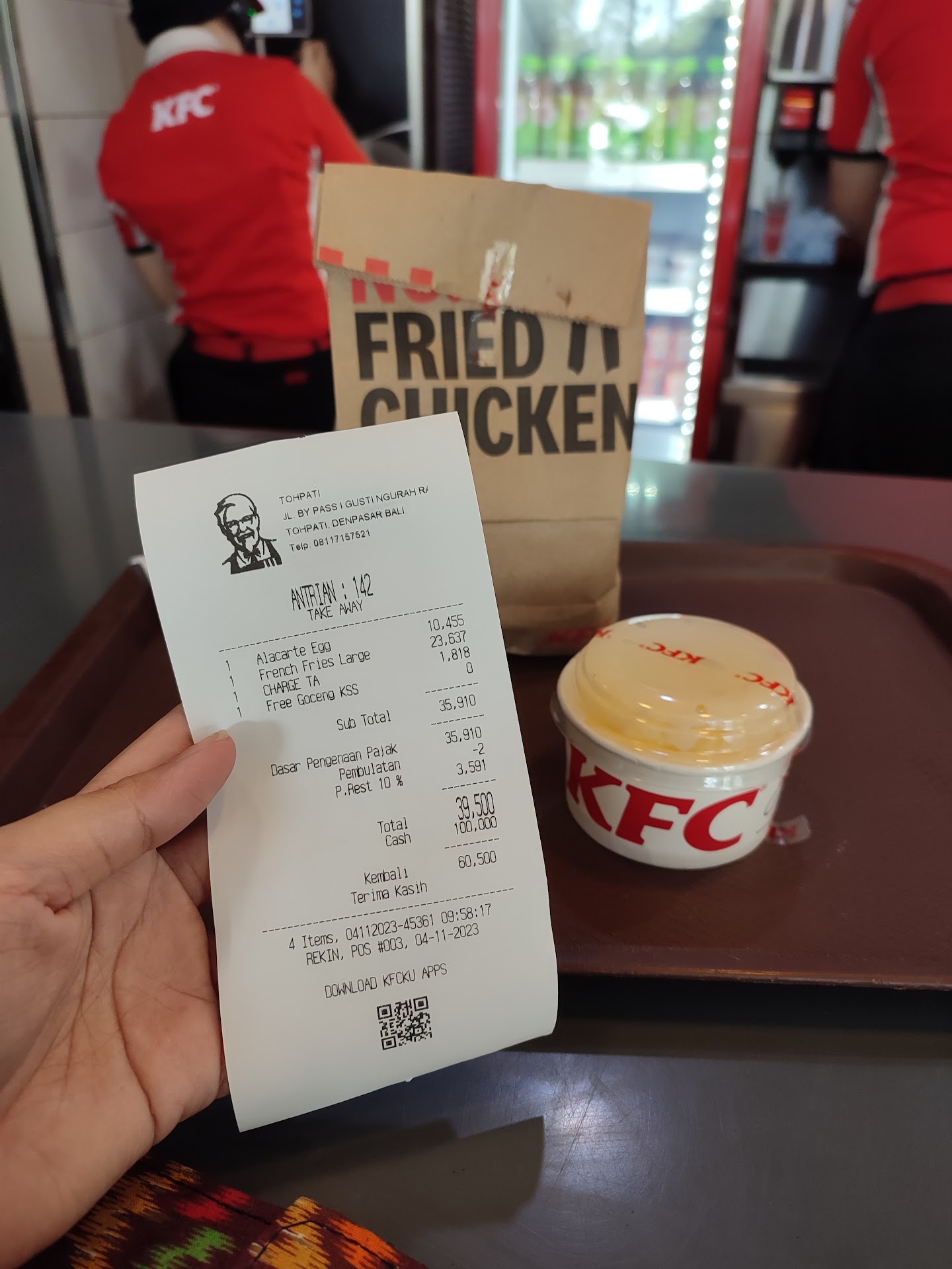 Ā Ā Ā Read moreDisappointing as staff need training as all customers had to wait for orders.. in my case 26 minutes.. but KFC Indonesia still has the best fried chicken.. please train your staff in this unit.. went there again today..12 July 2022.. customers lined up at counter with no mask on and staff not tell customers to wear mask..I spoke to manager but she didn't care.. my order took 20 minutes to arrive ..so much for being g a fast food outlet.....