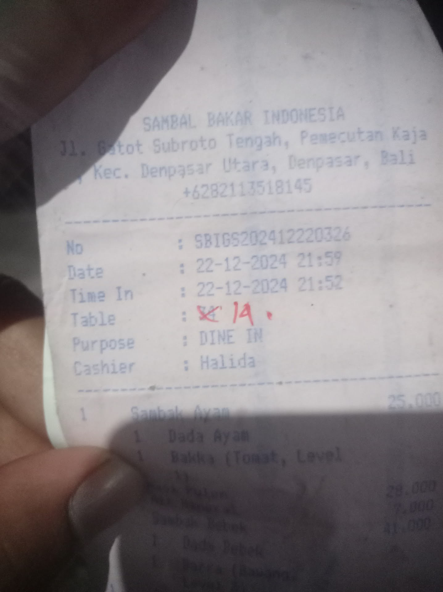 We ordered 2 sambak chicken with sambal barra for both. We requested 1 thigh 1 chicken breast and came 2 chicken breast while being informed that the thigh is not ready yet. Note that i ordered through the scan menu and paid at the cashier and informed the cashier i want 1 thigh for the chicken. The chicken was too dry it’s practically become crispy chicken. Taste was average. The sambal that i expect too be hot and spicy was super basic that my partner -who doesn’t eat spicy- said that the sambal is not spicy. And there’s no aroma from it that can make you drool over it.