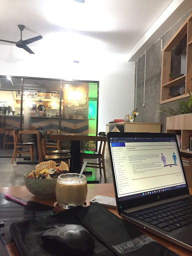 ย ย ย Read moreKali pertama berkunjung ke sini karena nemenin suami wfc. Suasananya oke banget, mana banyak tumbuhan yang buat mata dan buat aura cafenya jadi sejuk. Di tempat ini ada area outdoor dan juga indoor, di indoornya ada tempat lesehannya sedangkan di outdoor ga ada. Untuk pelayanannya oke, staffnya ramah semua. Untuk makanan dan minumannya pun termasuk enak, suami pun suka kopinya, dan aku suka banget juga sama dessertnya. Kemarin pesen nasgor kampung sama pesen nasgor chicken katsu, tapi lebih endul nasgor kampungnya.
