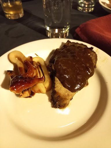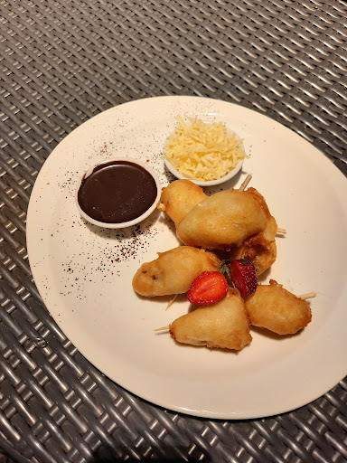 Pisang Goreng (Rp.53.000,-) terhidang dalam piring besar berwarna putih dihias taburan coklat bubuk pada setengah bagiannya. Pisang goreng ditusuk kayu mirip sate dengan dua wadah berisi coklat leleh serta parutan keju sebagai celupan. Pisangnya sendiri sudah matang jadi terasa manis dan lembek. Tambahan coklat leleh mirip saus memberikan sensasi manis yang chocolatey bernuansa milky. Parutan kejunya pun cheezy dan sempurna.