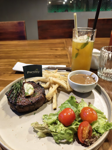 I had a breakfast right at 8 in the morning and they were ready with most of the menu, even though it was said breakfast menu would be only as listed. I got Mix Platters which served 2 slices of barbequed chicken wings, 2 pieces of barbequed sausages, 3 slices of breaded onion rings, and a handful of tortilla chips, with thousand-island like sauce (I do not know what sauce it is, but taste guaranteed). Not to mention though, on the menu display, the Mix Platters seemed to give only one slice of each snack, I was surprised they got more!! If only other restaurants do the same, serving more portion than the display.😂😂😂 For the drink, I got hot milk tea, served with variety of sugar, like slimming sugar, brown sugar, and fine sugar. I got a lovely breakfast. Thank you, Parsley. Happiness is when I realized I wore green floral dress and Parsley was all about green. 🍀🍃🌿🌾 Oh, I should pay for 60,900 rupiah but the lovely cashier let me pay only 60,000 rupiah for 29,000 Mix Platters, 24,000 Milk Tea, and tax. Lovely food, lovely place, lovely...