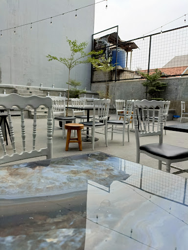 Didalam ruangan sengaja dibiarkan terbuka tanpa sekat. Kontur tanah berundak disiasati dengan menerapkan pola tangga-tangga pada tiap perbedaan ketinggian. Meja kursi kayu berpasangan mengisi hampir seluruh sudut ruang yang sebagian meja dilapisi keramik bernuansa jamrud. Pada dinding berjendela menempel sebaris meja bar yang menghadap ke arah luar. Area pemesanan bersanding dengan dapur tertutup, meja barista dan lemari display kudapan yang membentuk siku.