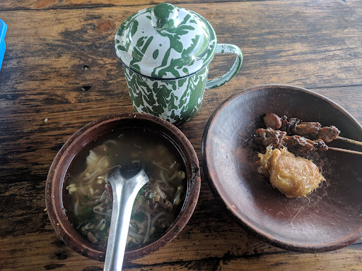 Place where you can get breakfast and dinner. Opens until 9PM. The portion is small, two would be enough. serving lots variety of skewers, fried things, and crackers. The soto itself is ok, not really recommending it. The fried chicken one is tasty, i like it. Hot drinks served in a traditional container. The service is quick, depending by the waiting list. Overall it's ok....