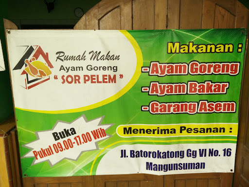 Read moreAyamnya enak dan empuk dagingnya, Nasinya lembut dan sambalnya mantap joss nendang banget, Bumbu ayam garang asemnya mantap dan berasa banget asemnya. Tempatnya bersih dengan parkir yang cukup luas. Suasananya rindang dengan dipenuhi oleh banyaknya pohon mangga. Mudah dijangkau dari pusat Kota. Waktu tempuh hanya lima menit dari pusat Kota. Untuk Harga terjangkau dengan rasa dan harga yang cocok dan pas. Pelayanan Gak Pakai Lama, cepat dan ramah. Bisa delivery order juga. Pokoknya mantap nih Rumah Makan, Recommended banget buat orang orang yang lagi jalan jalan ke Ponorogo dan sekitarnya. Belum ke Ponorogo kalau belum singgah di Ayam goreng Sor Pelem.....