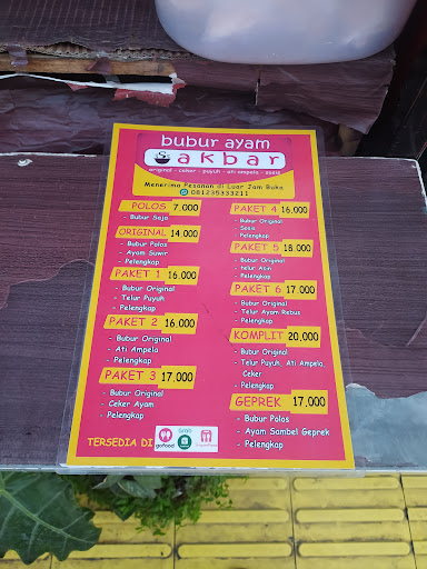Read moreTempatnya cukup kecil, karena ada di depan rumah, paling cuma bisa 2 - 3 orang kalau makan di tempat. Tapi buburnya enak, dan harganya terjangkau. Bisa pilih paket komplit, original atau pun tambahan lauk seperti sosis, ati ampela, ceker, telur puyuh. Paket komplit kalau gak salah 16 ribu, original 10 ribu dan tambahan...