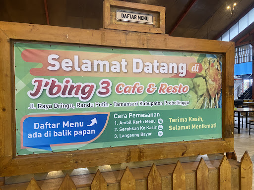 J’bing 3 cafe & resto is a spacious cafe in probolinggo. They have a quite big parking area and a playground. The dining place is big, too. We can choose whether we want to sit in an usual dining table, or cool “lesehan”. The way to order the food is unique, too. They prepare a board with menu cards, complete with the price and the food picture, to make us easy to order. We try the nasi goreng, cap cay, mie goreng and tahu. And we can say, their nasi goreng is very delicious 👍🏻 So do the mie goreng (fried noodle). One thing to improve is the cleanliness of the resto 😅. We can find some tomatoes or garnish left in the floor, and the table is quite dirty when we wipe it with tissues. But i think this is a nice resto. Consider to come here again when we visit...
