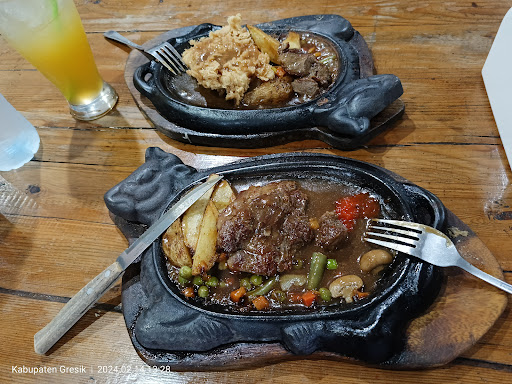 Read moreJadi, tempat ini sebenernya udah ada lama banget, dari.... Kayaknya dari aku smp dulu, dan sekarang aku udah kuliah semester 6 Nah, tapi waktu itu sempet sepi, terus akhir-akhir ini kayaknya udah direnov, jadi rame lagi Hal yang pingin kutanggepin adalah, kayaknya aku nyesel, kenapa gak ke sini dari dulu aja wkwkwkwk Kalo dari dulu aku udah ke sana, pasti bakal langganan terus Sesuai namanya, ya ini tempat makan yang menu utamanya steak, meskipun ada juga menu lainnya Steaknya bisa pilih, mau daging apa ayam Selain steak, ada juga kayak spaghetti, dll... Terus minumnya juga variasi, kebanyakan kayaknya jus Steaknya, ada pilihan mau cuma 1, ato double wkwkwkwk (itu yang pake kentang) Tapi, ada juga menu yang pake nasi, dan itu termasuk menu hemat :3 Menu hemat ini juga sekali se-minumnya, seperti pada umumnya, es teh Tempatnya, menurutku agak kurang strategis sih, soalnya pas banget sebelah lampu merah Jadinya kayak, parkirnya (apalagi buat mobil) itu ngehalangin jalan Apalagi kalo misalnya lagi rame '-' Tempatnya nggak begitu luas, tapi cukup lah wkwkwk Jadi, tempatnya dibagi jadi 2, indoor sama outdoor Kalo indoor, juga dibagi lagi jadi 2, mau yang ac-an apa nggak Begitu dateng, pelayannya bakal nanyain mau duduk di mana, terus langsung ngasih menunya Oiya, pelayannya juga ramah ramah Teruuuusss, tempatnya berwi-fi!!!! Jadiii, pas banget buat nongki nongki emang Udah makannya enak, nggak mahal juga (ini alasan kenapa aku nyesel karna baru tau harganya lumayan murah), berwifi Bisa laah, ajak kumpul kumpul keluarga ato temen ke sini Yak,...