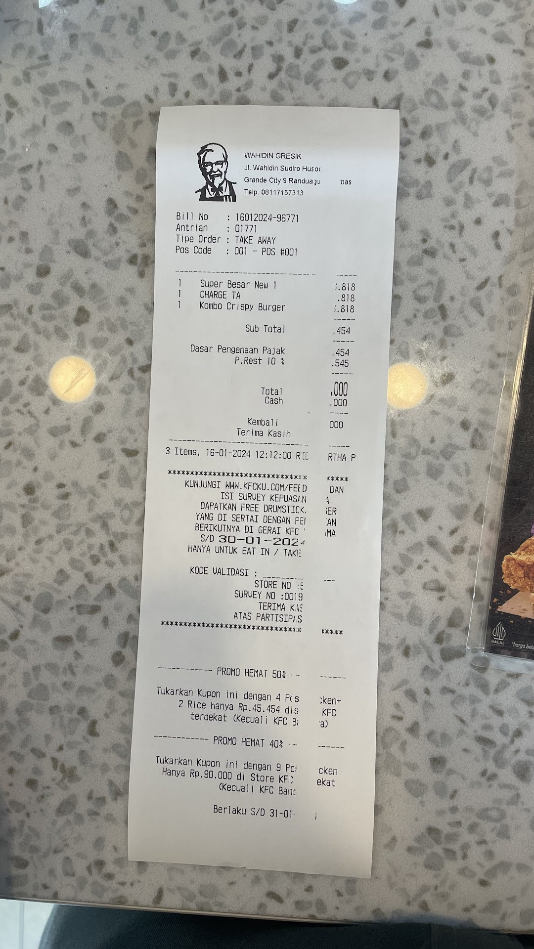 Read moreSebenarnya saya mau kasih bintang 1, tapi karena pelayanan kasirnya notbad jadi bintang 2 buat service. Disini saya barusaja take away untuk menu yang terlampir di struk, tapi entah mengikat plastik cola atau bagaimana, cola tsb tumpah padahal perjalanan dari restoran sampai tempat kerja ngga sampai 5 menit (dapat dilihat posisi cola yang miring saja tidak tumpah, berarti cola satunya tidak terikat dengan baik. alhasil makanan saya full basah karena cola (terselamatkan kentang karena posisi diatas burger). Saran saya percuma ada charge lebih untuk take away tapi kemasan tidak terjamin. Struk juga tidak jelas angka awalnya. Mohon maaf bukannya tidak percaya dengan KFC tapi kita sebagai konsumen jadi tidak tahu apa yang diinput disana. Untuk service mohon untuk tidak terlalu buru-buru dalam membimbing customer memilih menu. Untuk makanan saya kasih rating 1 karena saya ngga jadi makan sama sekali dengan mengeluarkan 80rb+ Mohon untuk bisa dijadikan...