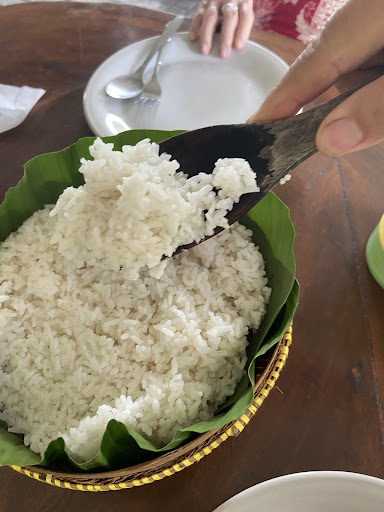 The fried chicken is served with fried coconut flakes (serundeng). It’s savory, crispy, and subtly sweet—thanks to the serundeng.