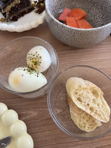 We chose our breakfast from the menu where you can customize your own plate. I ordered two slices of bread with egg and fruit salad (which was really good!). The service was quite fast at first, but when our food arrived, we were a bit surprised – the “slices of bread” were so small that we honestly thought it was a joke.