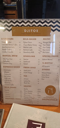 Read moreSore itu bulan Oktober 2020, saya pengen kongkow santai sama keluarga, sekalian pengen nyoba2 tempat makan. Akhirnya pilihan jatuh ke Kopi Djitoe yg tidak terlalu jauh dari rumah. Tempatnya kalo dari RS UGM ke utara, nanti belok kiri ke barat sebelum perempatan lampu merah arah Cebongan. Tidak perlu khawatir karena sudah ada papan kecil yg bertuliskan Kopi Djitoe. Sekitar 200m belok ke kiri jalan nila, jalannya kecil berbatu. Waktu itu sore hari menjelang magrib, dan sudah ada beberapa pengunjung. Dari pintu masuk, ada tangga kecil untuk masuk ruang indoor. Di situ kita bisa langsung pesan saja dan langsung bayar. Harga cukup terjangkau. Ada banyak menu, baik kopi, cemilan atau makan berat. Kalo pengen di ruang outdoor, kita bisa masuk lagi ke dalam melewati beberapa tangga. Saya pas dapat bangku pojok yg belakangnya pas latar sawah. Sepertinya itu bangku favorit kalo pengen foto2. Desain interior dan bangunan nya berhasil membuat suasana nyaman. Apalagi tempatnya memang gang buntu, jadi suasananya agak sepi, cocok buat ngerjain tugas. Untuk makanan dan minumannya tergolong enak semua, hanya saja masaknya agak lama untuk makanannya, jadi lumayan nunggu. Kalo penyajiannya cepat, saya kasih bintang 5 deh he he. Tapi overall tempatnya asik kok buat ngumpul...