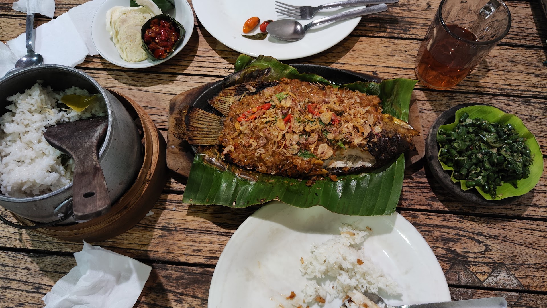 Foods were okay. The pencok kacang panjang was delicious but portion was small for that price. 4 of 5. It can be 5 of 5 if portion was bigger. Nasi liwet was okay, nothing special. 4 of 5. The Ikan Bakar bumbu cobek was horrible. Almost 50% of the fish eas burnt to dark black, and the cobek was basically peanuts smashed, no other flavour. 1 of 5.