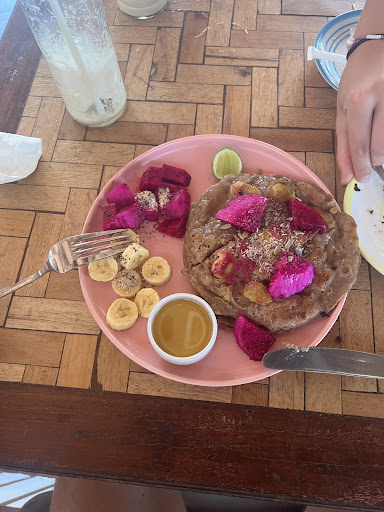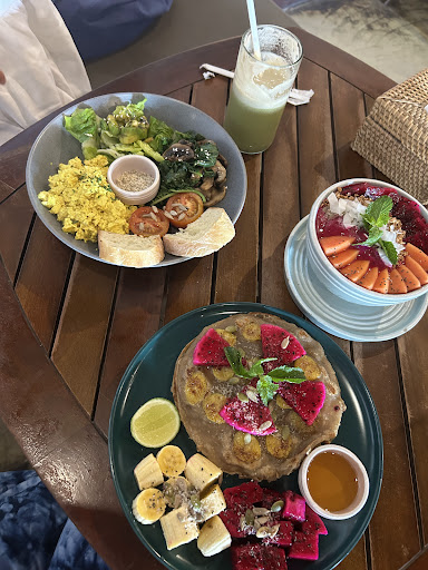 Read moreThe best vegan pancakes I ever had. Chewy and slightly sweet because of the Banana. The dragon fruit layered in between the pancakes was also delicious. We went there again the next day and I had to order them again cause I loved them so much. The vegan tofu scramble really had an egg like texture and didnât taste like regular tofu at all. I would definitely recommend. The restaurant has a lot of vegan options. The cakes and pastry is also vegan friendly. The chocolate brownie was so delicious. There was real slightly melted chocolate inside. It was chewy, fudgy and just melted on your mouth. The juices were also good and refreshing. When you order a smoothie bowl you can even choose two fruit toppings. If you order eggs you can add veggies on the side like smoked/ grilled tomato. The bread/ baguette that comes with some dishes was good but nothing special. The coffee mugs are so cute cause they have a coffee and thyme logo printed on it. There arenât tons of options on the menu but everything we ordered was delicious. Coffee and thyme is one of my favorite breakfast spots in...