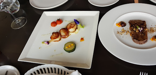 Elegant, Contemporary, and Sophisticated Restaurant with beautiful subdued theme stonewall decor yet not overtly appointed. Impress your date or client here. A terrific gran view personicates Thamrin to Kunigan. Therz a gf (ez upfront sign find) walkup concierge as an escort to private elevator for 46th floor 4 restos. They expect your arrival, as if rolling out the red carpet for you, then guide you along to your dark greygreen hardwood table. Warmly greeted, you'll be seated and handed page menu, then actually asked about your desired beverage or winelist given. Therz a full bar too. BYOW is allowed, you'll be billed a corkage fee, so be sure its worthwhile special bottle. Attentive staff is ready to take your orders at all times. For starters we shared 4 'quarter size' cool bay scallops that were artsy presented on folded spinach stools, over sesame spread and balsamic drizzled, topped with tiny basil leaf on a white rectangular plate. I liked it. She had the petite Tasmanian salmon. Skin was a bit crispy tho the thick slice was evenly cooked. I ate the Greenland halibat. Both were served warm. (these were lunch cuts instead of dinner size portions considering the price) Those few heaping tablespoon bites were fresh tasting and standardly delicious. I requested how I wanted it cooked. I prefer lemon squeeze, pepper, & paprika while sizzling pink salmon ala plancha. I also had hoped for pan sautee whitefish with lemon & blackpepper season sprinkled atop. But Neither cooking style Showdup. No flame grill option either. I don't know if it was managers miscommunication or chef's inability, yet still their ordinary way was good enuff. Everything I ate was pleasant. If I knew though that the small sizes were ala carte I would've ordered sides. I figured rice or spuds or mixveges shouldve been an automatic addon. My Mustake, tho I Did inquire to Mgr, about preparation first as I wanted it. Next time I'll try omaha beef there. I score this dining experience 8.75 of 10. My own 12 y/o Carneros Chard was decanted expertly by GM Michelle. (it had to be done since the cork grumbled as he saved my superb 90+ vino.) My wife's hot ginger tea pleased her. Last but not least, those straight from the oven madelienes and chocolate balls on cakewafers were a splendid...