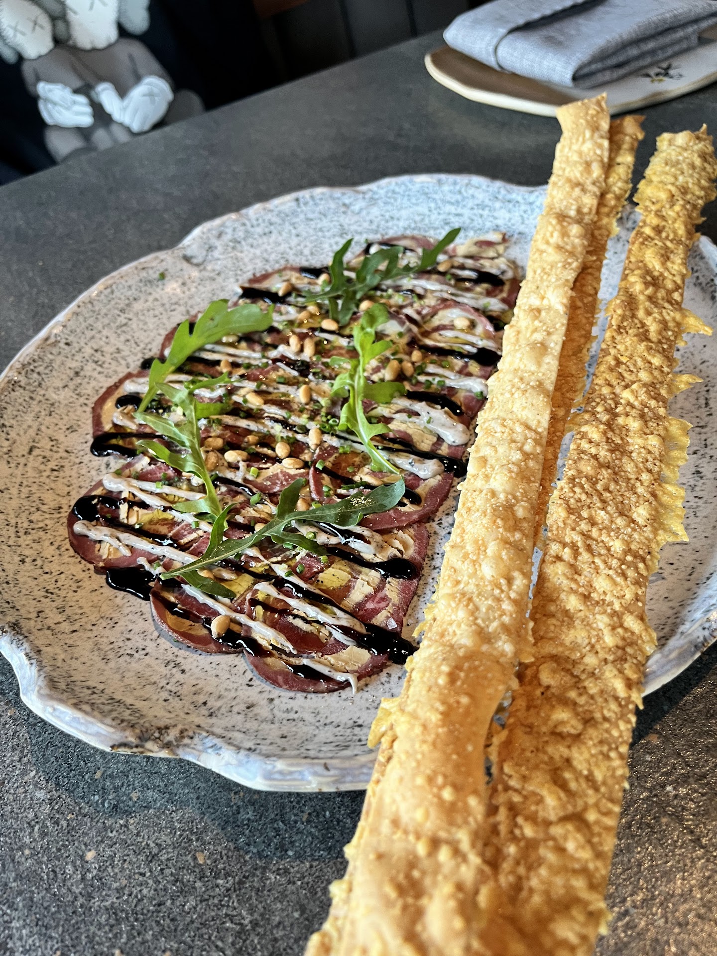 We got the Wagyu & Foie Gras Carpaccio, the new Octopus menu with hummus, Beef Tartare from the Aged + Butchered (they always let you cross-order from all the restaurants in the building!), the cured pork that is on the house, one pasta that I'm not sure what the name is, Spanish Carabineros, and then another pasta, ravioli, that I'm not sure also about the name lol.