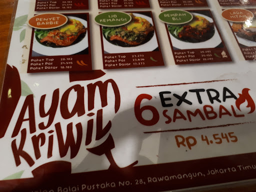 Read moreBaru saja dapat pengalaman pahit di Ayam Kriwil Rawamangun. Sabtu, 28 nov 2020 sekitar jam 19.00, saya datang bertiga dan duduk di bangku outdoor, order 1 Paket Top Ayam Bakar Rempah Bali paha, 1 potong Ayam Goreng Kriwil paha, 1 Tumis Kangkung, 2 es teh tawar. Lalu waiter yg sama saat order sempat datang lagi mengecek apakah ayam gorengnya tadi pesen paha atau dada. Saya ulang lagi paha.