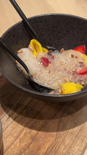 ⢠Tokoroten A refreshing healthy dessert perfect for summer, with Japanese noodle jelly, sliced fruits, yuzu sorbet, mochi dango, and granola. The Tokoroten jelly was freshly cut into noodle form and all the ingredients are mixed together before serving. The fruits are really fresh and the mochi dango balls have a nice chew. Itās not easy to find Tokoroten and this was a great experience. You can get this to share!