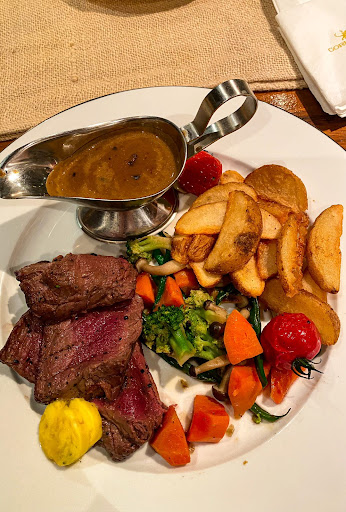 Read moreCame here for weekend brunch, and had the tenderloin steak and eggs and loved it. The portions are generous, steak was juicy and perfectly done. Fried diced potatoes were crisp and well-seasoned with fresh rosemary. My only gripe about the plate was the poached eggs I requested, which ended up being very vinegary, rubbery and rippled-looking. If ordering poached eggs, tell the chef not to add vinegar to the water, or to be very judicious about the amount. I asked for a change of eggs, and the omelette turned out much better (quite fluffy). The Belgian waffles are the best I’ve had. The batter is extremely fragrant, resulting in a super crisp and light waffle. Maple syrup is surprisingly good quality (or very good pancake syrup). The Chantilly cream is to die for, and fruits are refreshingly tart. The Caesar salad with roast chicken was very good and generous, with an interesting aioli for sauce. The blackberry smoothie is super fragrant and complex, but lots of seeds so be warned. Great place for brunch (if you're not bothered by smoke since the smoking area is...