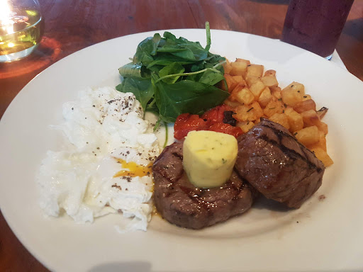 Read moreCame here for weekend brunch, and had the tenderloin steak and eggs and loved it. The portions are generous, steak was juicy and perfectly done. Fried diced potatoes were crisp and well-seasoned with fresh rosemary. My only gripe about the plate was the poached eggs I requested, which ended up being very vinegary, rubbery and rippled-looking. If ordering poached eggs, tell the chef not to add vinegar to the water, or to be very judicious about the amount. I asked for a change of eggs, and the omelette turned out much better (quite fluffy). The Belgian waffles are the best I’ve had. The batter is extremely fragrant, resulting in a super crisp and light waffle. Maple syrup is surprisingly good quality (or very good pancake syrup). The Chantilly cream is to die for, and fruits are refreshingly tart. The Caesar salad with roast chicken was very good and generous, with an interesting aioli for sauce. The blackberry smoothie is super fragrant and complex, but lots of seeds so be warned. Great place for brunch (if you're not bothered by smoke since the smoking area is...