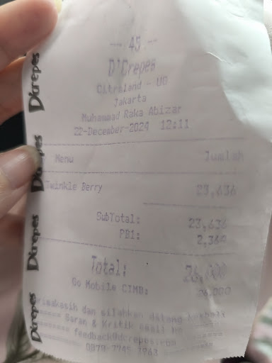 Read moreAlways love D'crepes. For me they are authentic, tasty and really love the crunchy texture. I ordered the traditional peanut and chocolate, its to die for. I also order Beef Burger, the mayo is superb. The meat tender and flavorful. Thumbs up D'crepes they manage up at the surface considering the tight competitions. Accept payments using cash, debit card, credit card, Ovo, Gopay, Shopeepay and Dana. Virtual wallet payment usually get...