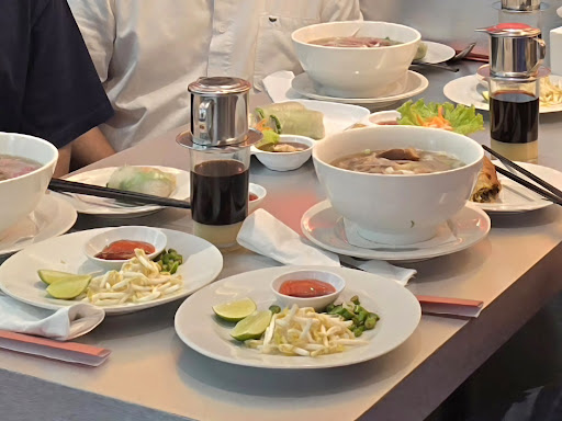 Vibrant Vietnamese kitchen serving traditional fare in warm surrounds with red brick walls.