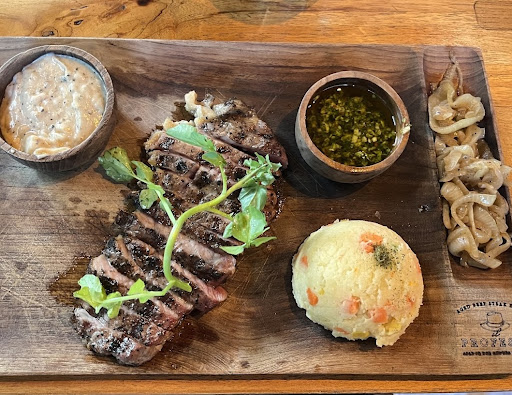 When I said Grill?, I imagined other dishes and flavors, like other Grills in this city and the world… it is a local bar with normal dishes and some meats, if we see it as local, it is normal, it is good. My partner ordered the dish in the picture, the flavor and texture were good, nothing magnificent or interesting, (and that is not a Russian salad as they say, it is a small puree with some pieces of carrot) 250k, plus another salad that was good, and like the menu itself, it did not seem attractive to me, it is very common and scarce for a grill house… something told me that mm… so I only added a meat sandwich “” the menu said, which the truth is I did not even take photos like I usually take of everything, because it was an old hard bread, toasted, with 4 meat sandwiches per side of bread, green leaves, tomatoes and oil on the bread… I left some of the bread and finished the rest, since it was tiny, and I wanted to eat… so then I ended up eating a huge ice cream in another place in that small...