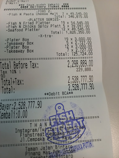 Yang saya pesan : Fish n Fried Platter (54.545) Seafood Platter (49.545) Fish n Pasta Cheese Melt (49.545) Fish n Spicy Chick Platter (39.091)