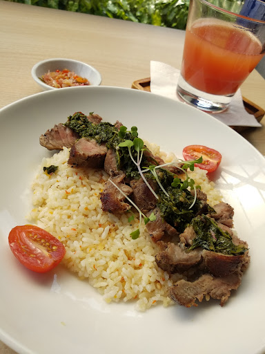 The cold pressed juice is great, really great even, so eveb at 38 K for a single glass, one does feel it is still a bit worth it. Sadly i don't think the same can be said about the beef chimichurri. The tomatoes are nice, and i get what they are trying to achieve with the slightly al dente garlic rice, sadly they seem to have tried too hard to cater to a more universal palate - i really could have used a more pronounced herbiness or spiciness along with a more discernible garlic taste. Luckily the sambal matah is quite okay, although having to add 8 K to the bill for it kinda makes me wonder if i should have just gone for other spicier menus in the first place.