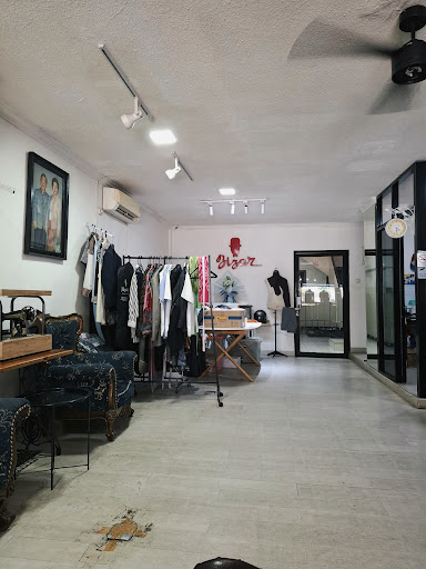 Coffee shop mungil ini punya satu lokasi 2 in 1 place dengan toko jahit 'Bizar'. Jadi kita masuk ke toko Bizar ini, lalu kita akan disuguhi meja barista+kasir dengan vibe Tailor di belakangnya berornamen mesin jahit, kain, mannequin, dan jas.