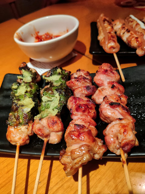 Kushiyakis (all in Shio) โข Buta Bara 43K - juicy but not as tender โข Negima 21K โข Teba 18K