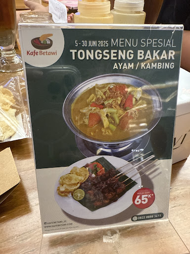 Read moreSangat disayangkan padahal saya langganan kafe betawi loh, tapi pelayanannya sangat buruk, sy mau pesan makanan trus sama pelayannya ditawarin menu paket yg dimeja, sy tanya itu sate kambing tongsengnya jg kambing dong? Trus mas nya bilang iya, klo sate ayam sate nya juga ayam, trus sy liat gambarnya kok tongsengnya gak ada dagingnya??? Trus sy tanya lagi dong sm pelayannya mastiin klo tongsengnya ada dagingnya apa sayurannya aja, dia bilang gak ada, trus sy gak jadi dong, lalu kita ganti menu eehhh malah mas ny nyolot sambil kretekin kepalanya 😱😱😱 sambil jutek bgt mukanya gak bilang iya atau gak, trus nasinya jg gak ikut di cancle dong, sy bilang lg mbak nya, mbak nasinya gak jd, karna sy pesan beda menu, eeeh mas nya bilang gak bisa, pas debat boleh akhirnya, sy pesan minumnya 4 dia bilang 3 haduuuuhhhhh masa kita ber 4 minumnya cuma 3, harusnya dia Happy dong kita gak pesen yg promo, persennya yg lebih mahal, aturan kita pesen 3 porsi ini jd 4 porsi. Terkadang yahhh kita sdh sopan sm pelayannya, tp pelayannya malah gak sopan, sy tau kok kalian capek kerja, sy pun lagi capek lagi laperr dihadepin hal kaya gini bukannya mood makan malahhh jd badmood. Untungnya makanannya enakkkk, jd trauma tau gak tiap kali mau makan liat review google dlu...