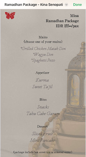it is WAAYY overpriced. our group ordered 5 Mina packages for iftar (idr 155+) which includes the picture i attached. when we arrived, there were only 3 plates of snacks that consisted of 3 pcs dates, sweet ubi chips, and tahu cabe garam on each plate. we complained and said we are 2 plates short, but to our surprise the waiter said that this is correct, and in fact they gave us “extra” 😂 he said the plate was meant to share for 2 pax. 3 kurma for 2 people?