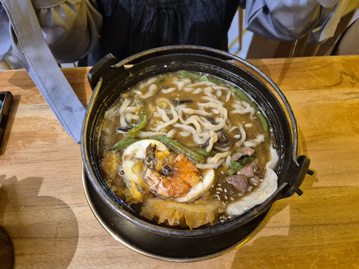 Slow response from the crews; I ordered the hot pot without knowing the type of noodle I may choose, yet they didn't try to offer such information, what I got was ugly fat noodle (can't really say it's close to udon), totally turning off my apetite. Relatively big part of the collagen broth is grease/oil and it tastes bland (This is a matter of preference so it's ok). The way they brought the cheese was nasty, yet again totally turning off my appetite (x2). It was 3 P.M., not its peak custimers hour and they're pretty slow in processing the checkouts. Also the space is very narrow, you'll find yourself disturbed many times while queueing by the crew moving around.