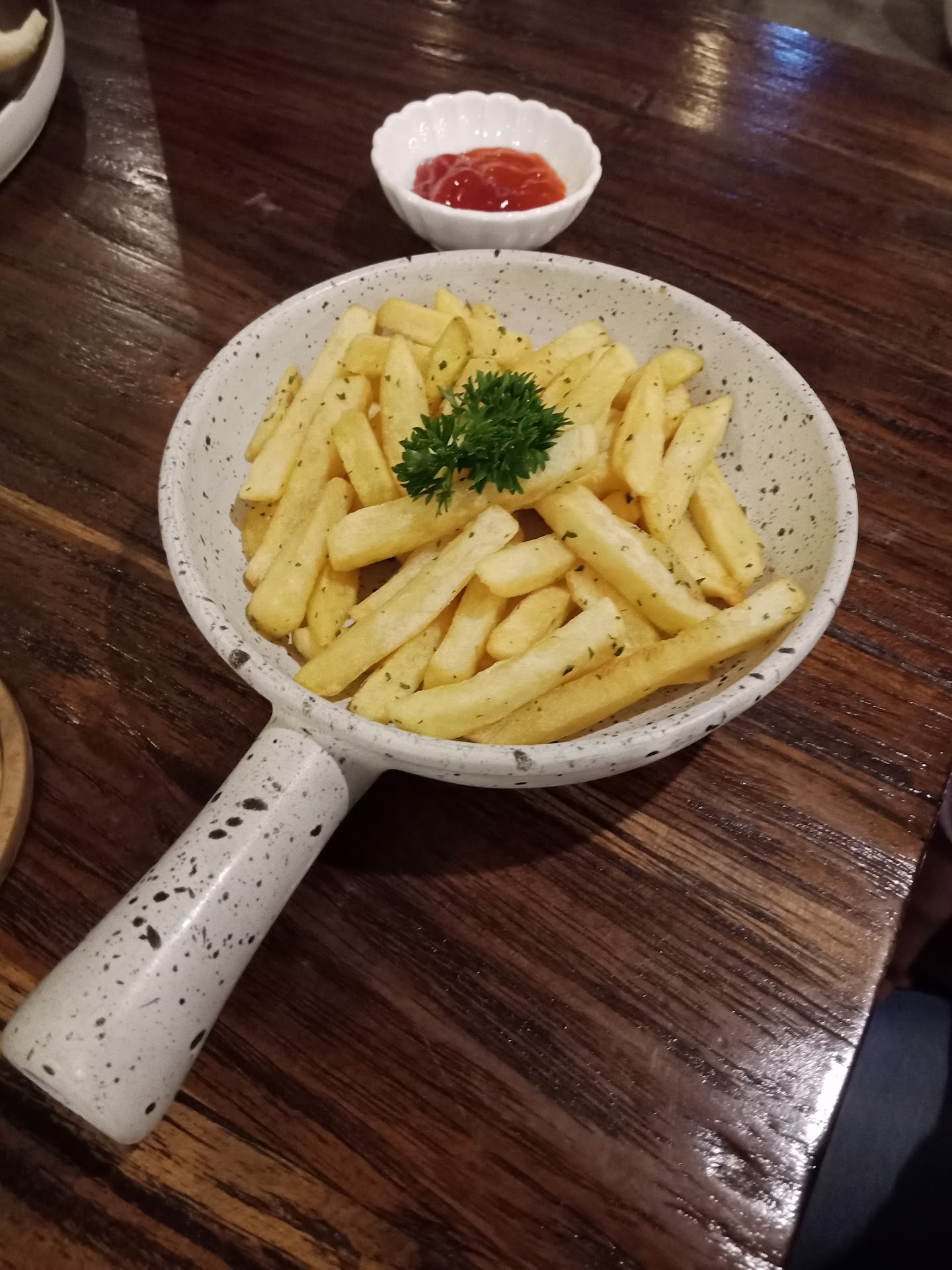 French Fries (30k) Cemilan yang ga boleh terlewatkan adalah kentang. Kentang ini di taburi dengan keju dan rasanya garing diluar, lembut di dalam. Meskipun kategorinya cemilan, tapi bikin perut kalian kenyang juga lho 😀