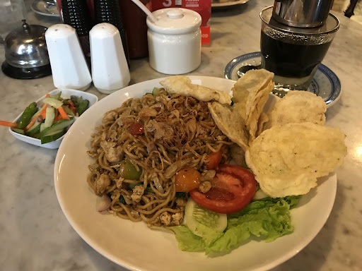 I just know that this place is Pak Bondan's cafe. Then i realized at the down below menu there is Pak Bondan face or signature picture. So, do not get hesitate to enjoy your coffee time in here. The easy way to get there is come in from Sarinah (mcd sarinah) take a straight way until you can see the traffic lamp then turn the left. Take another straight way until you can see another traffic lamp but don't turn to anywhere. See from your left side, this coffee shop will be seen there. Yep, before you go to Nasi Goreng Kebon Sirih, you will through this place! The building looks so old school without noisy bilboard or anything but I like it. Pak Bondan keep the classic theme for his place. And when you come in, the decoration, seat and table are so old school and vintage too. With some of pictures with some words hanging in the wall. Very very classic. In front side is for non-smoking area, if you are looking smoking area you go straight in to deep the coffee shop and then you come in a quite dark room with good space smoking area. Again, the decoration, seat and table with pictures and words hanging in the wall with old school style are there. But don't worry, although the place is so old school and classic, you still can feel cozy and comfy. I saw that way anf felt that way too. There is also good and nice smell and clean restroom. To call the staff or waitress you can press the bell that available in every table. The menu? So variative. So many options but I've seen more noodles options or light meal options there. And the most cute things is how every menu get the namr write down in. With Dutch spelling with Dutch writing style. Some picture are vintage style simple, claddic and cute. Again, so so old school but uniqe and different in a good way! The coffee? Well, taste really strong and deep and I know Pak Bondan will never disappointment us. His taste of coffee, you can't never and need it to hesitate about it. It's like you drink a very good quality coffee beans chosen to get serve there. And it makes me remembering his expression when he give a good compliment for good meals and drink which is "maknyus". It was such a honorable for me to get chance to got my coffee there. I know, some people might not agree with me but thats fine. Maybe how we describe about coffee are different and thats normal and good. But I loved this coffee place! If the price feeling too expensive, I will say...
