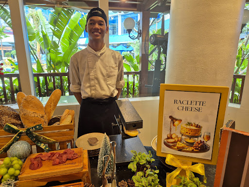 All the items mentioned on their website were available. Roasted turkey, Texas bbq ribs, Salmon Wellington, etc. They were served with Brussel sprouts wild mushroom ragout glazed carrots, etc. There was also an Indonesian and Chinese section with local specialties. I was specifically amazed as they were serving raclette. I never had raclette anywhere other than in Switzerland. Although raclette is a very wintery dish, I enjoyed it as I associate Christmas with cold weather.