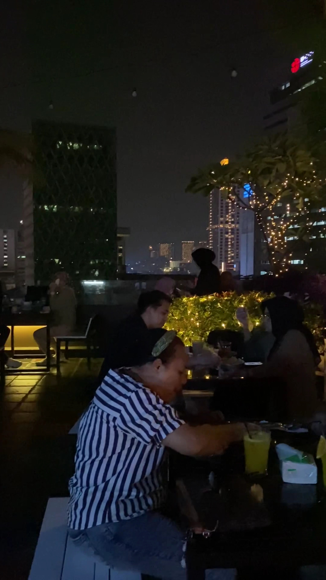 Read moreSaya dinner disini krn kebetulan menginap di Hotel 101 Thamrin. Setelah baca2 review, tidak menyangka kalau cafe ini cukup fenomenal dan pernah kontroversial. Walaupun tidak dress up well krn memang tidak berniat apapun selain makan, saya kebetulan pakai sepatu jadi aman tidak dicegat staf atau diwajibkan sewa alas kaki dari sana. Anyway here is my testimonial: Lokasi cukup strategis dari pusat kota Jakarta, mudah dijangkau dengan kendaraan pribadi atau publik. Ada parkiran yg cukup walau tidak luas. Untuk naik ke cafe harus melalui lift hotel yg hanya ada 2. Liftnya sendiri agak creepy krn seperti cukup oldies. Cafenya sendiri di rooftop dekat kolam renang hotel dengan konsep outdoor, ada yg dengan atap dan ada yg tanpa atap. Jadi tidak ada AC, kalau siang pasti cukup panas. Furniturnya lebih ke konsep bangku kursi kayu bukan yg tipe resto fancy. Ada hiasan tanaman2 asli sbg sekat. Untuk hari jumat malam dan weekend ada minimal order 125k & 150k dengan time limit. Perbedaan harga hanya di posisi duduk. Kalau 150k bisa duduk mepet dinding luar dengan view citylight. Pengunjung auto dapat semacam welcome snack (cemilan/klethikan). Saya datang sendiri. Saat saya minta pindah meja krn tidak kuat dengan bau asap rokok di dekat meja cashier, oleh waiter dibilang tidak bisa. Alasannya kalau mau pindah meja harus close bill dulu dan open order baru which means another 125k or 150k. Hmm kaget juga saya. Minimal order itu tidak ada diskon walaupun untuk tamu hotel. Pilihan menu makanannya cukup beragam. Ada masakan nusantara dan western. Harganya lumayan pricey menurut standar saya. Makanan di kisaran 70k ke atas, minuman di kisaran 40k. Saya pesan sop buntut selangit harga 110k, ada juga sop buntut biasa dengan harga sama. Bedanya kata waiter hanya masalah porsinya, katanya kalo selangit lebih banyak. Rasanya cukup enak, porsinya juga cukup mengenyangkan, penyajiannya juga cukup cepat meskipun cafe ramai pengunjung. Minuman jahe hangat rasanya B aja dengan harga 30k. Live musicnya lumayan seru, pengunjung larut dengan suasana untuk ikut bernyanyi bareng. Untuk atmosphere saya cukup enjoy, kecuali bau rokoknya. Fasilitas lain seperti toilet bersih juga tersedia. Untuk pemandangan citylightnya lumayan tapi nggak yang wow banget. Pelayanan menurutku sih ya cukup friendly, waiternya juga lumayan sopan. Cuman aneh aja dengan kebijakan pindah meja itu, padahal saya niat pindah di row yg sama hanya biar menjauh dr asap rokok aja apalagi saya sedang hamil muda. Overall dibilang tempat yg instagrammable kayaknya ngga juga, konsep cafenya agak bingung si kalo aku pribadi, mau dibawa ke arah fancy krn aturan dresscode dll tp kok interior dan utensils makannya biasa aja malah cenderung ke tradisional, tapi kalo dibawa ke tradisional kok harganya ketinggian. Hehehe no offense yaa kan pendapat saya. Untuk manajemen semoga bisa ditingkatkan terus kualitas pelayanannya...
