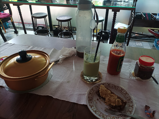 Read moreEnak tempatnya 😄 ada 2 lokasi outdoor sm indoor yg outdoor banyak tanaman jd adem indoor banyak barang yang bisa kita pegang&pakai kayak piano gitar buku2 dll, makannanya rata2 homemade tapi masih termasuk murah, makanan termurah mereka ada mi harganya 15rb yang punya bilang kaldunya dibuat sendiri 💗 cafe mereka punya cake of the day dimana setiap hari ada cake beda2 random dan harganya 1 slice 20rb. Pas saya pesen cake nya itu semacam choco brownies diatasnya dikasih pistachio + kunafa(kalogasalah) enak! Coklatnya berasa banget pistachionya juga ga kalah enak. terakhir ada matcha yang ice 28rb enakk jugaa nyambung sama kue nya. Maaf ya fotonya jelek ga jago foto🤣 tp presentasi aslinya cantik !