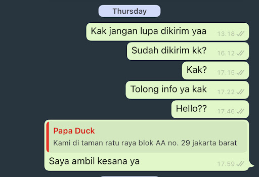 Sudah di setujui utk pengiriman jam 15.00, saya chat dari jam 13.00 utk minta kabar hingga jam 18.00 juga gak di balas. Padahal ONLINE status WA nya. Saya telp tidak di angkat juga.