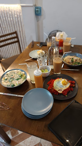 Kami pesan beberapa menu, yaitu: Roti bakar: tekstur dan rotinya pas. selai cokelatnya juga tidak yang terlalu manis apalagi bikin giung. Mie titi: rasanya persis sama spt yang saya biasa makan saat lebaran yang dibawa jauh2 langsung dari Makassar. seasoningnya pas sekali. porsinya cukup untuk berdua. Nasi goreng merah: ada hint rasa tomatnya yang memberikan rasa segar tapi kombinasi rasanya tetap pas di lidah (tidak mendominasi). Saya pesan yang porsi biasa dan cukup untuk berdua. Teh2-annya: tidak terlalu strong dengan rasa sepet dan manis yang pas. (saya yang punya maag pun ditawarkan oleh ownernya yang helpful untuk menambahkan susu ke teh pesanan saya jika dirasa terlalu sepet dan pahit).